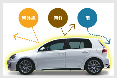塗装の上に配置するコーティング被膜は、塗装の身代わりとなって紫外線・酸性雨・黄砂を含んだ雨を受け、大事な塗装の代わりに傷み汚れてくれます。